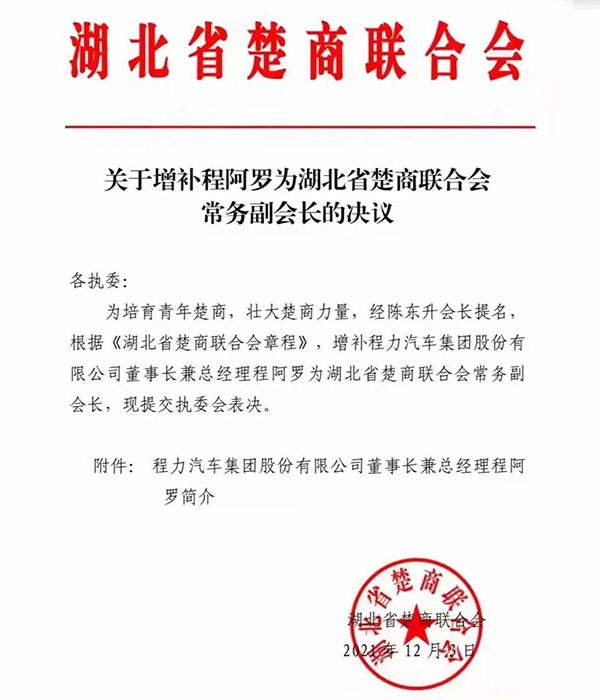 “虎威熠熠踏征程,八面來風(fēng)共聚首”,程阿羅總經(jīng)理作為省青企聯(lián)會長暨湖北省楚商聯(lián)合會常務(wù)副會長,由于其掌舵的程力汽車集團(tuán)在中國專汽行業(yè)所作出的突出貢獻(xiàn),特別是2021年在疫情反復(fù)肆掠,各種自然災(zāi)害和國際國內(nèi)市場震蕩低迷等不確定因素疊加效應(yīng)影響下,程力集團(tuán)萬眾一心攻堅克難,全年完成87億專汽產(chǎn)值,仍保持了2位數(shù)的百分比增幅,在全省“緩復(fù)蘇、補(bǔ)損失”的大環(huán)境下,保持了穩(wěn)健的發(fā)展勢頭,應(yīng)邀出席了湖北省年度經(jīng)濟(jì)工作會議,聆聽了湖北省委應(yīng)勇書記和王忠林省長的發(fā)言和工作報告,積極為湖北經(jīng)濟(jì)發(fā)展建言獻(xiàn)策。